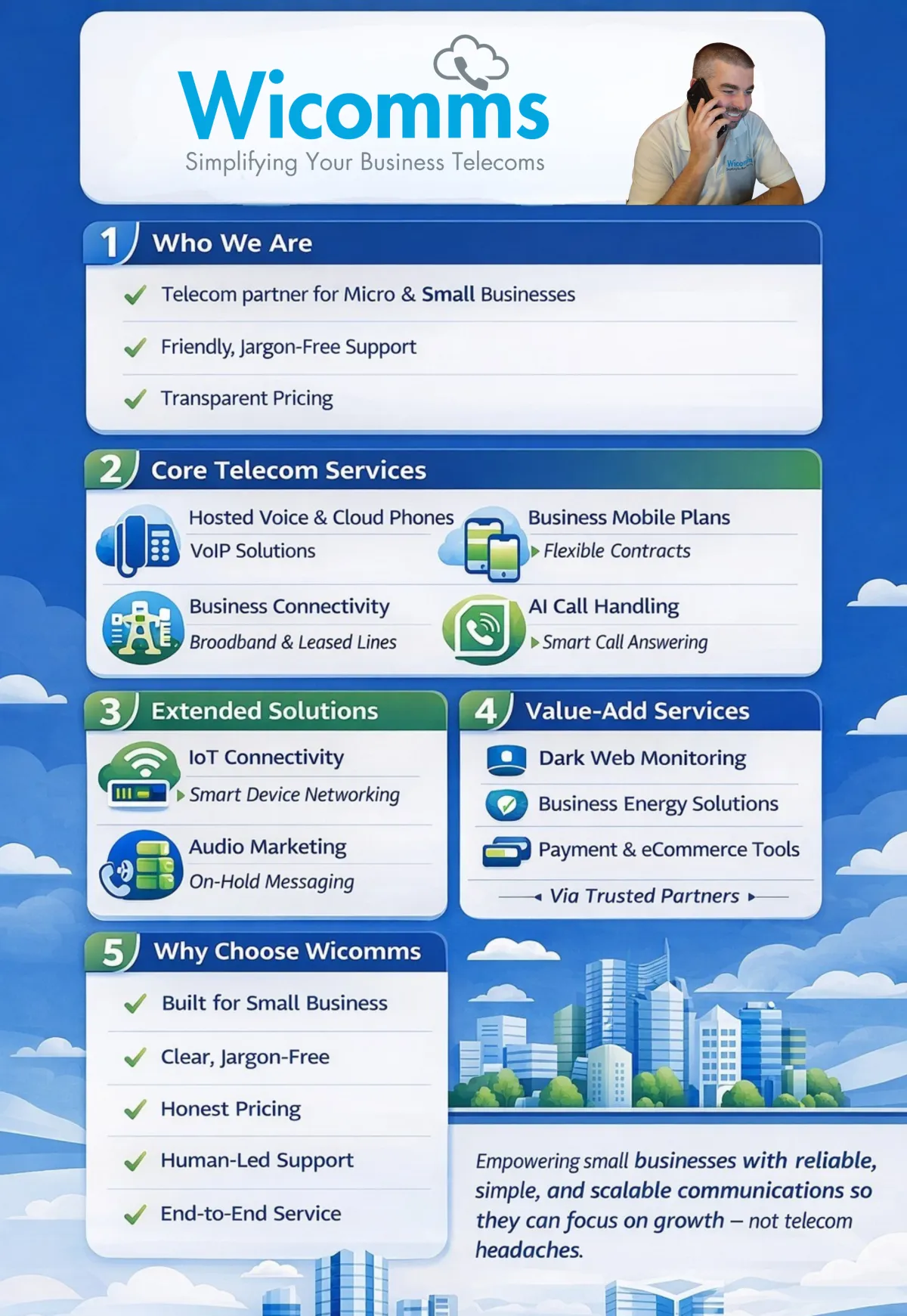 Wicomms might look like just another telecom provider — but we’re not here to sell you a phone system and disappear. We’re here to make life easier for micro and small businesses by simplifying the way you stay connected.